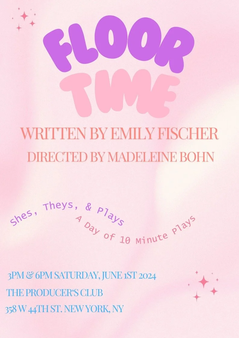 Floor Time written by Emily Fischer and directed by Madeleine Bohn. Starring Meg Johns, Katie Elman, and Stephan JoQuan. Premiered as part of the Shes, Theys, & Plays 10 Minute Play Festival at the Producers Club in Hells Kitchen, New York City.